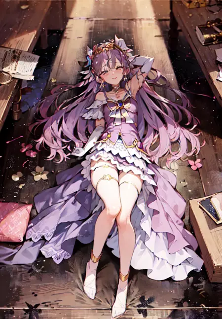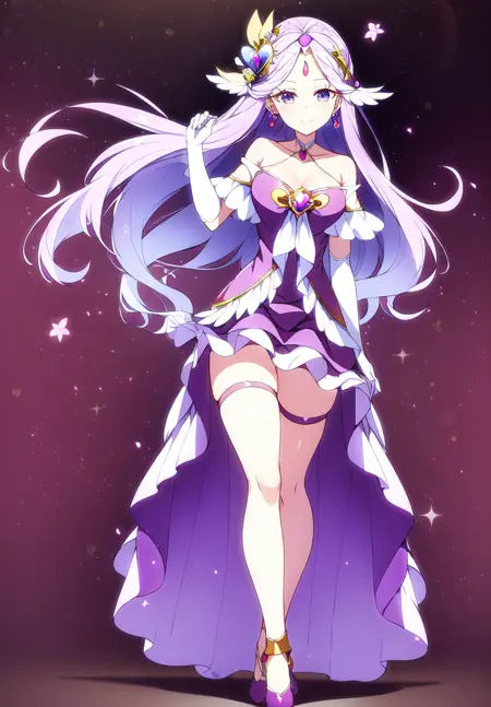 무릎 끈, 외투, 미소, 솔로, 팔꿈치 장갑, 부유한 머리카락, 장갑, 머리 장식, 하트 머리 장식, 다리 레깅스, 오프숄더, 오프숄더 드레스, 보라색 리본, 보라색 목줄, 스커트, 티아라, 흰 장갑, 물결무늬 머리카락, 보라색 드레스, 흉곽, 잎 모양 머리 장식, 이마 등...