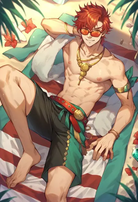 여름 버전: sylvainsummer, 빨간 원형 선글라스, 녹색 액세서리, 빨간 벨트, 보석, 남성용 수영복