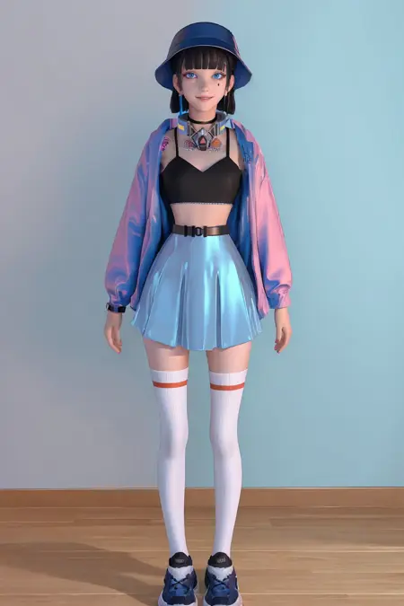 blue skirt, white thighhighs, rounded hat, pink jacket, belt, black crop top, pleated skirt, sticker, see-through, open clothes, choker, blue hat, earring, bracelet