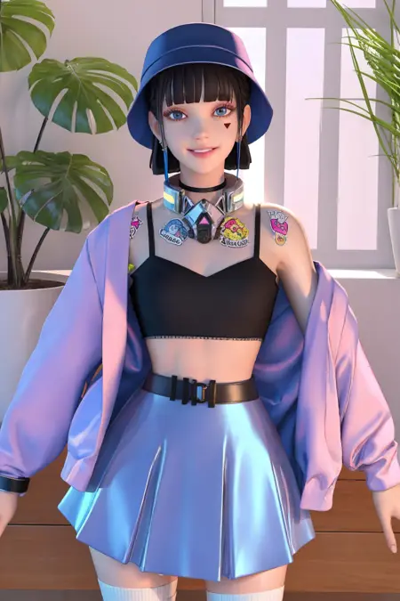 blue skirt, white thighhighs, rounded hat, pink jacket, belt, black crop top, pleated skirt, sticker, see-through, open clothes, choker, blue hat, earring, bracelet
