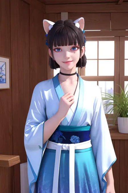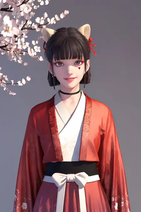 animal ears, red hanfu, printed skirt, hair ribbon, red shoes, floral print, white sash, short hair