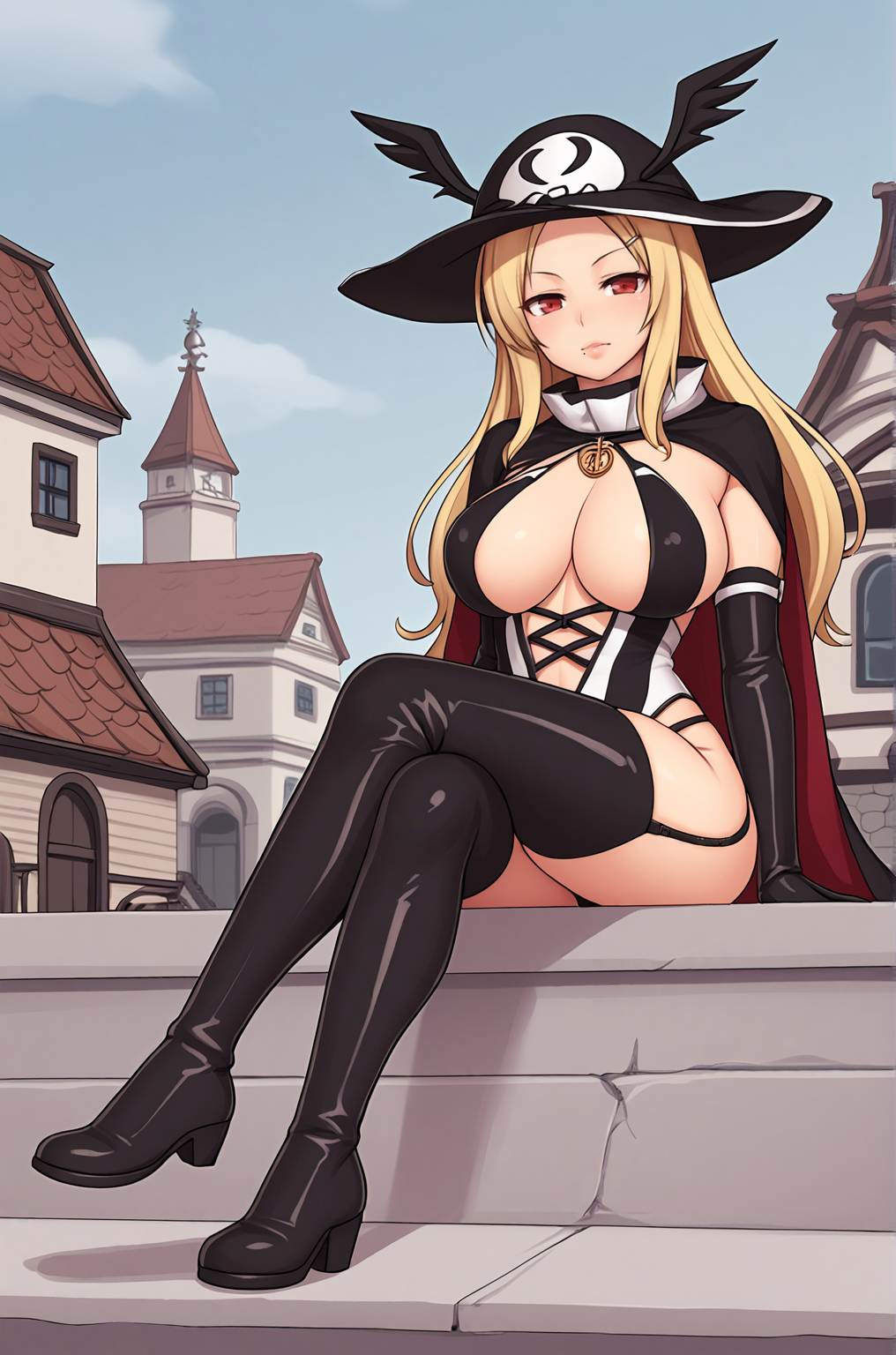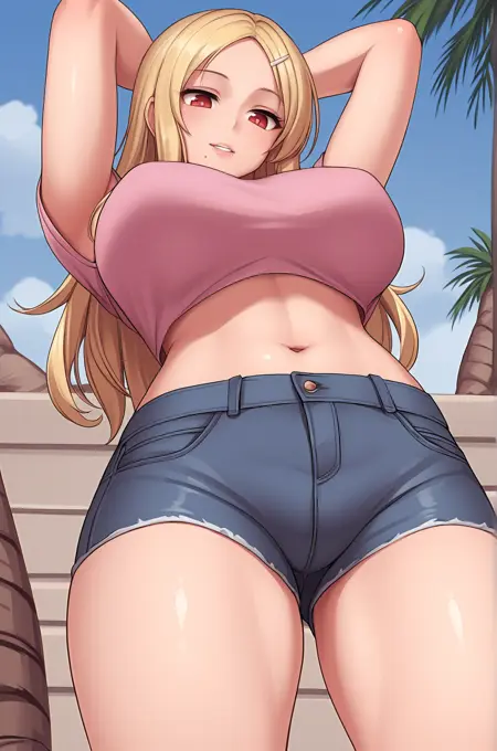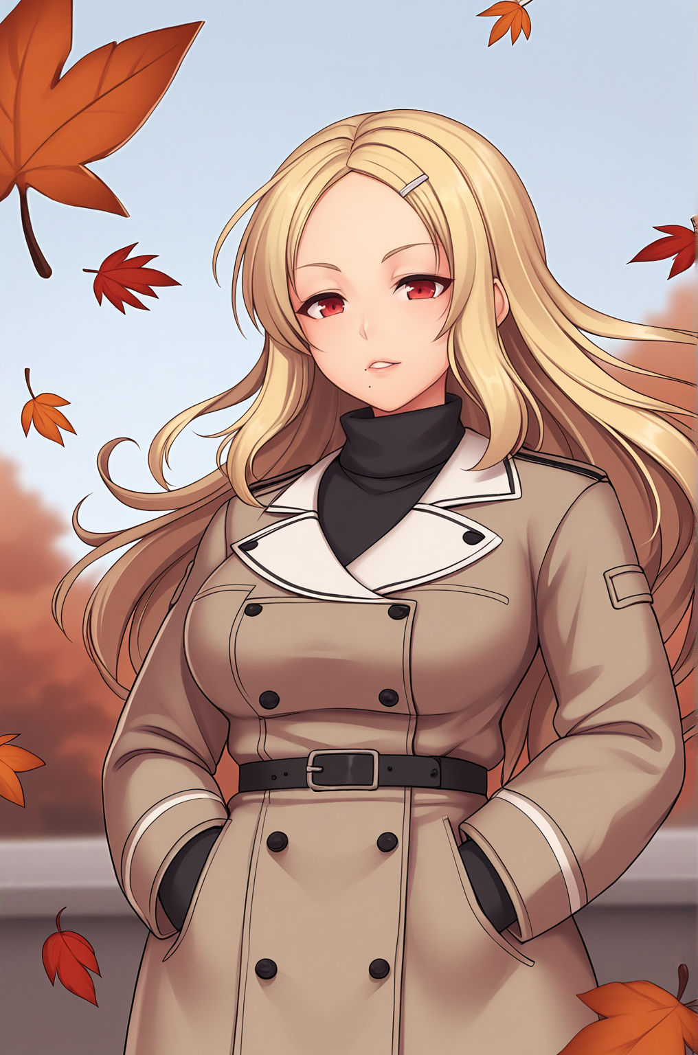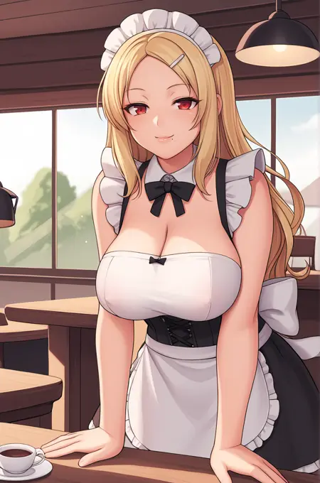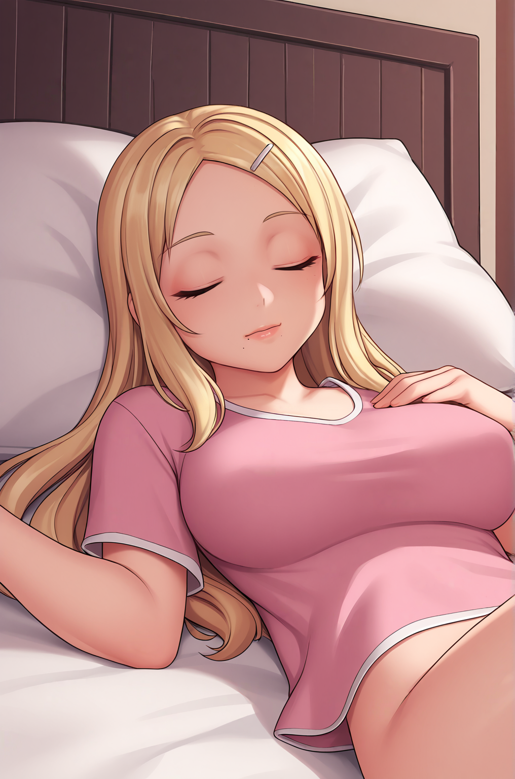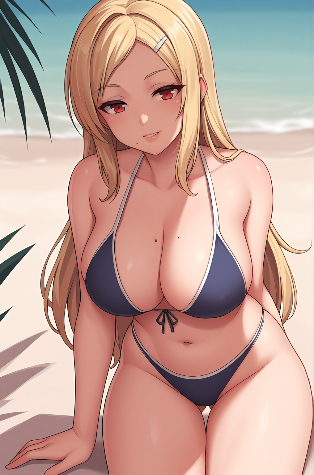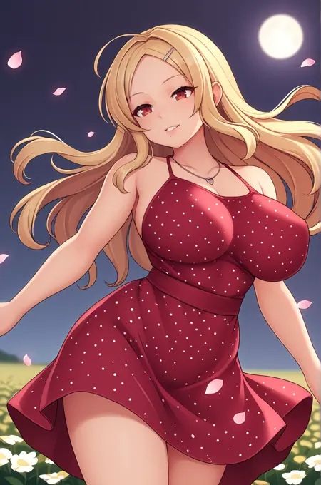 Trigger Word for the LoRA are "Shiki_XL, blonde, long hair, red eyes, mole under mouth, hairclip, large breasts,". Of course you can remove the "large breasts".