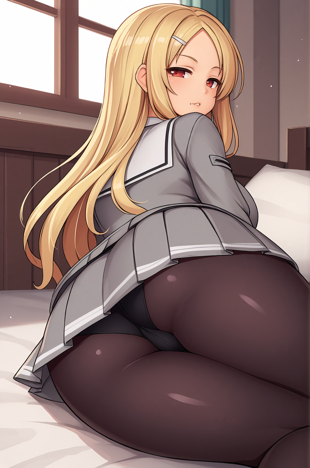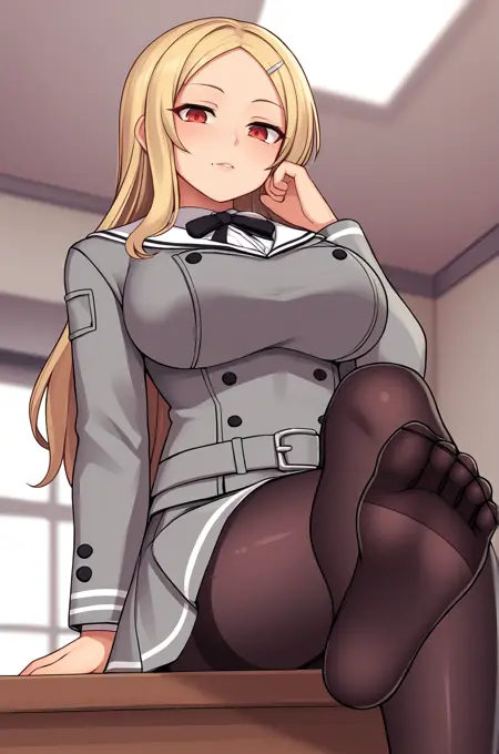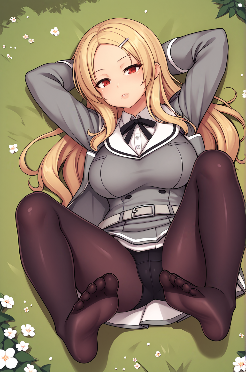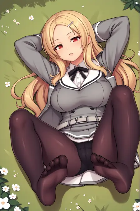 Trigger Words for school outfit are "shiki_school_outfit, school uniform, black pantyhose, grey jacket, grey skirt, neck ribbon, grey belt,".