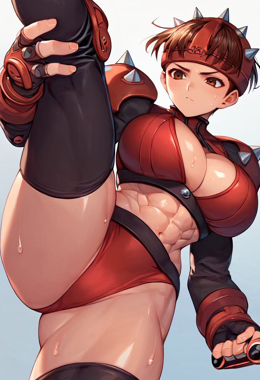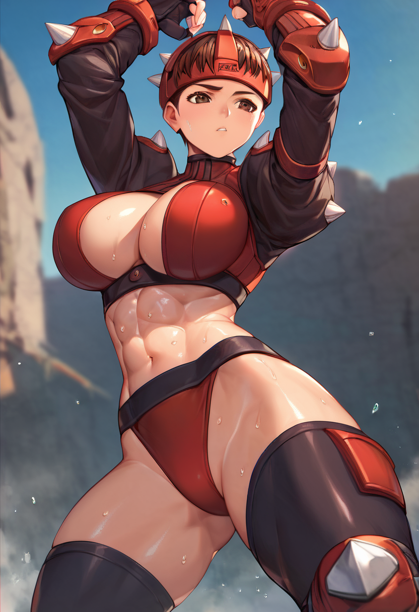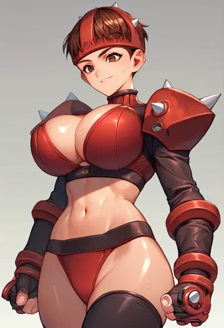 lora:super\_kurara0-05:1.0 1girl, super kurara, short hair, brown hair,gloves,thighhighs,fingerless gloves,brown eyes,black thighhighs,cleavage cutout, spikes, headband,crop top,knee pads,armor, [roller skates:0.5], red bra, red panties