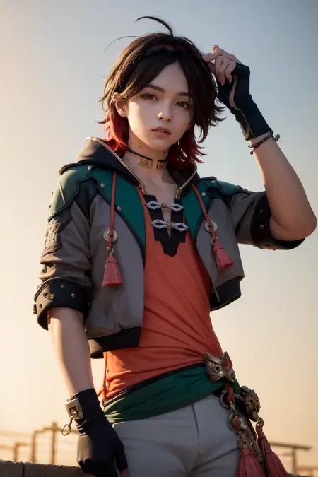 1boy, male focus, ahoge, multicolored hair, brown hair, short hair, hairband, brown eyes, choker, jewelry, hood, hood down, red shirt, black jacket, short sleeves, grey pants, tassel, fingerless gloves,