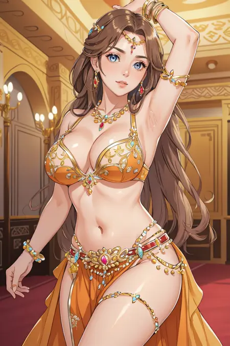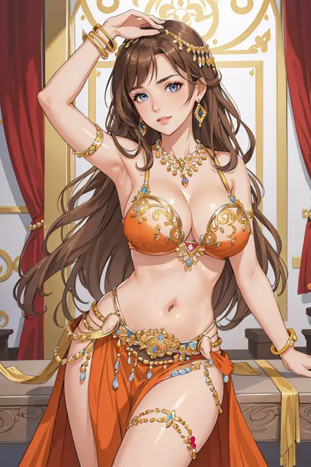 HUD_2_BllyDncr, gems, orange bra, arm band, anklet, long chiffon skirt, belt, jewelry