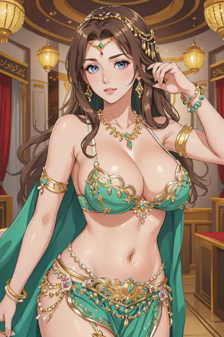 HUD_2_BllyDncr, gems, turquoise bra, arm band, anklet, long chiffon skirt, belt, jewelry