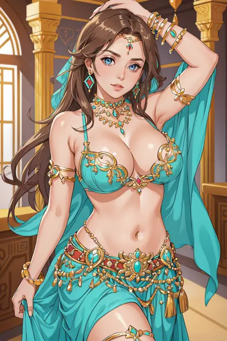 HUD_2_BllyDncr、宝石、ターコイズ色のブラ、腕輪、足首輪、長いシフォンスカート、ベルト、ジュエリー
