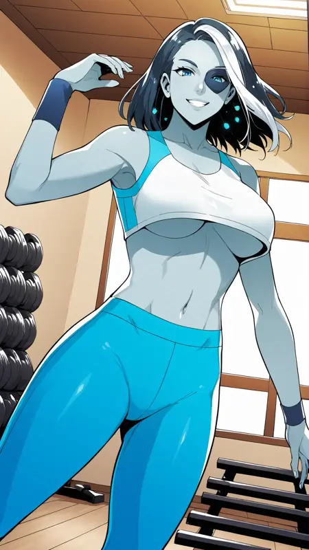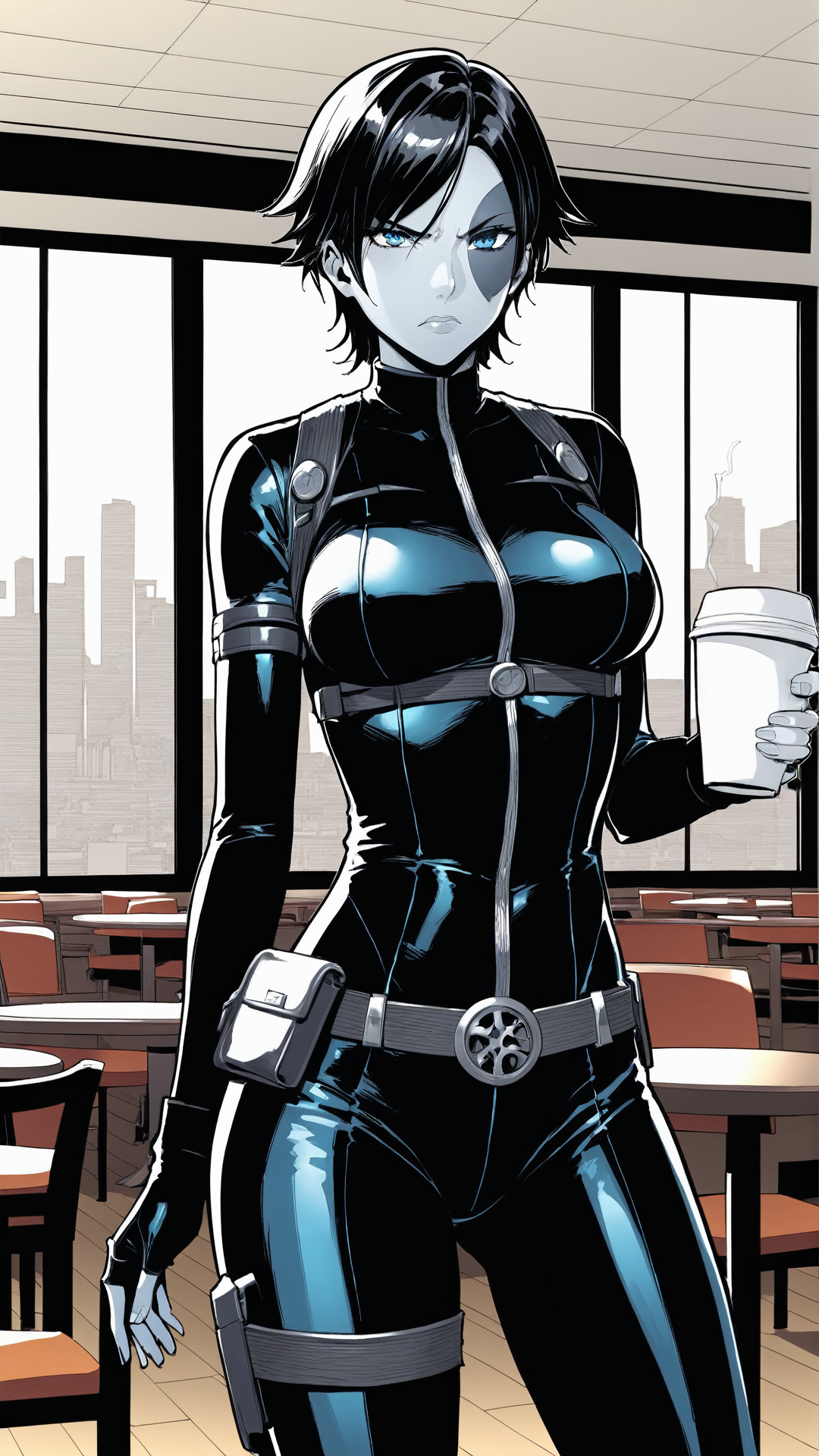costume 2: a woman, black skintight costume, gray skin, black spot on left eye, short black hair, blue eyes, belt,