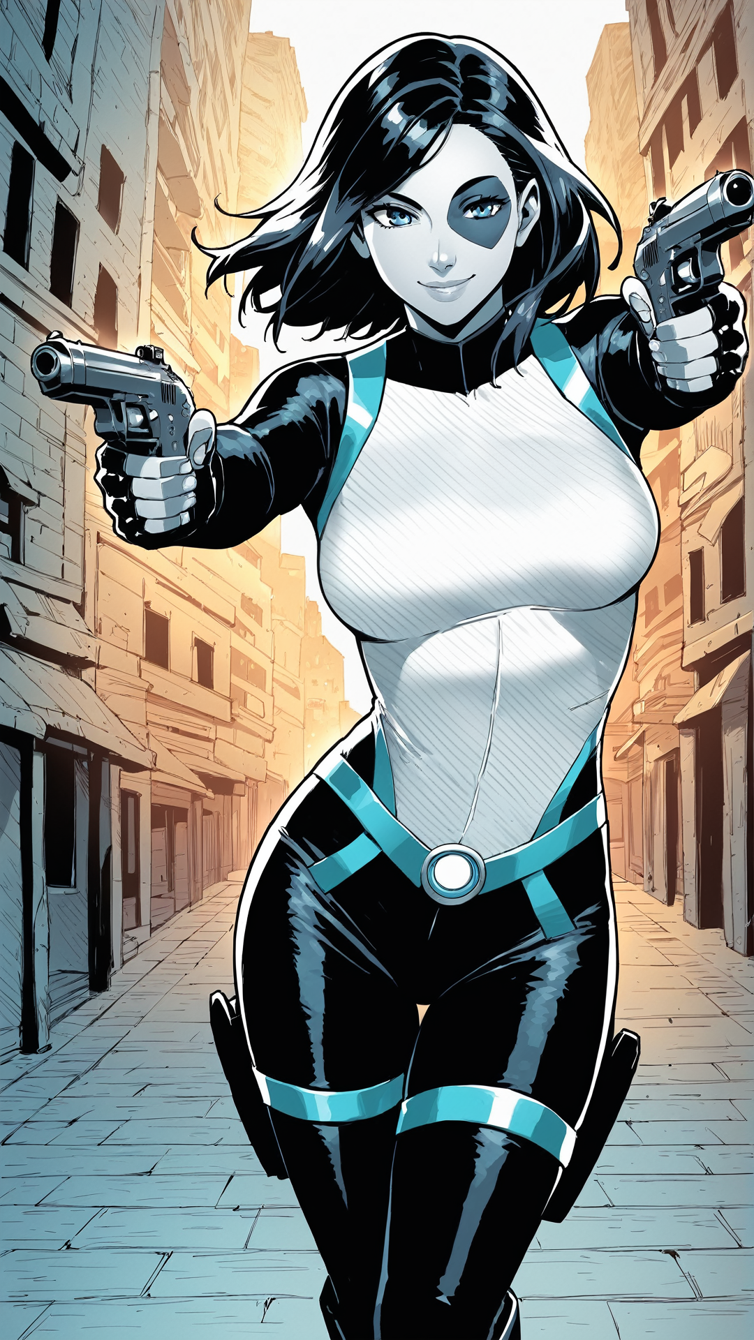 costume 1: a woman, black and white skintight costume, gray skin, black spot on left eye, short black hair, one white strand of hair, blue eyes, black boots,