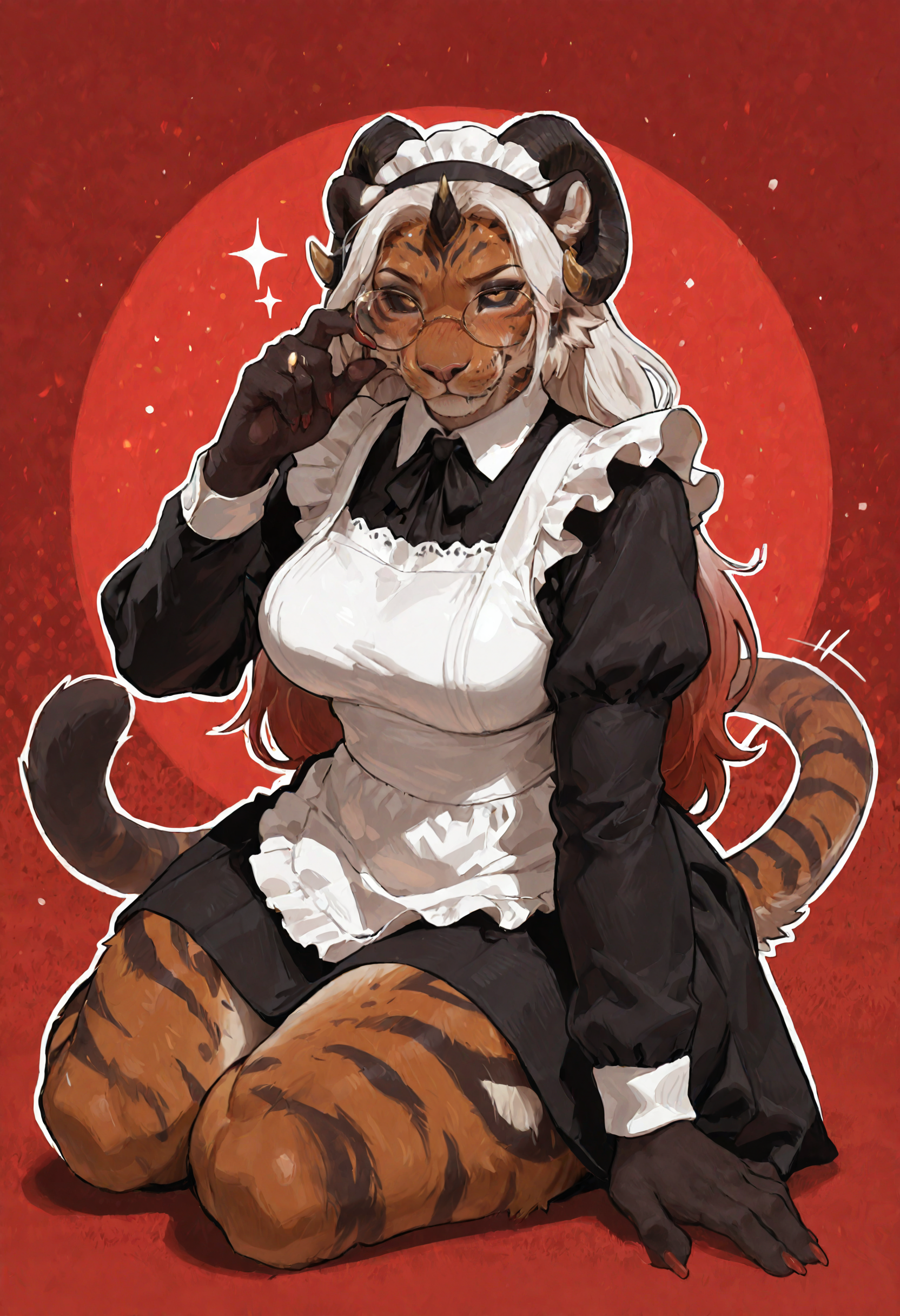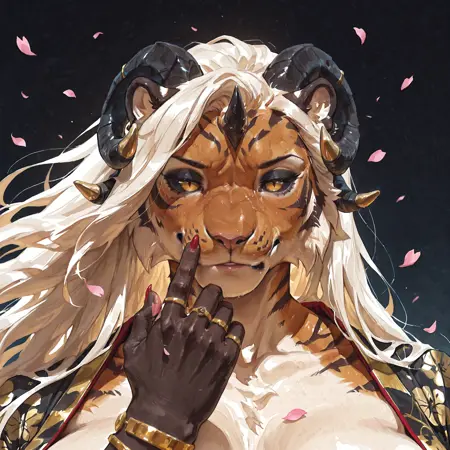 建议添加以下标签以提升生成准确性(若效果不佳时):老虎、长发、多角、黑色巩膜、竖瞳、红色蹄子