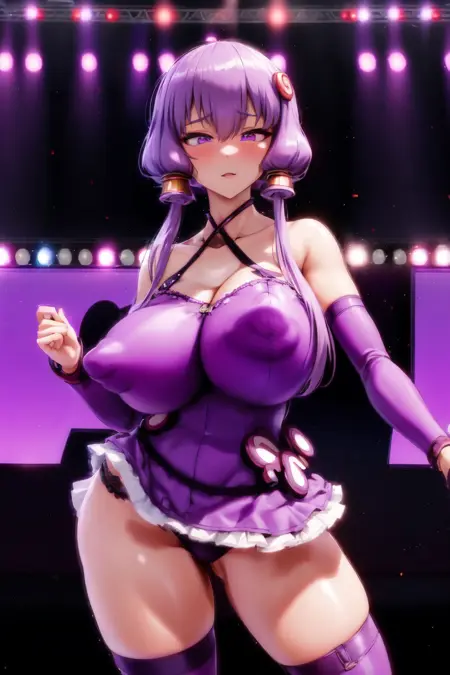 lora:YuzukiYukari_V01:1yuzuki_yukari, yuzuki yukari, 보라색 눈, 거대한 가슴, 노출된 어깨, 가슴 사이, 보라색 머리, 긴 머리카락이 달린 단발, 드레스, 유두 가린 상태, 검은 팬티, 보라색 허벅지 양말, 분리된 소매, 단단한 유두,