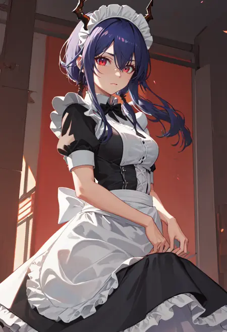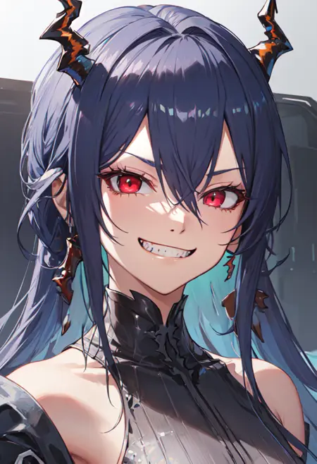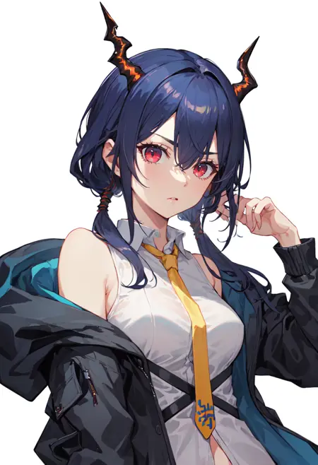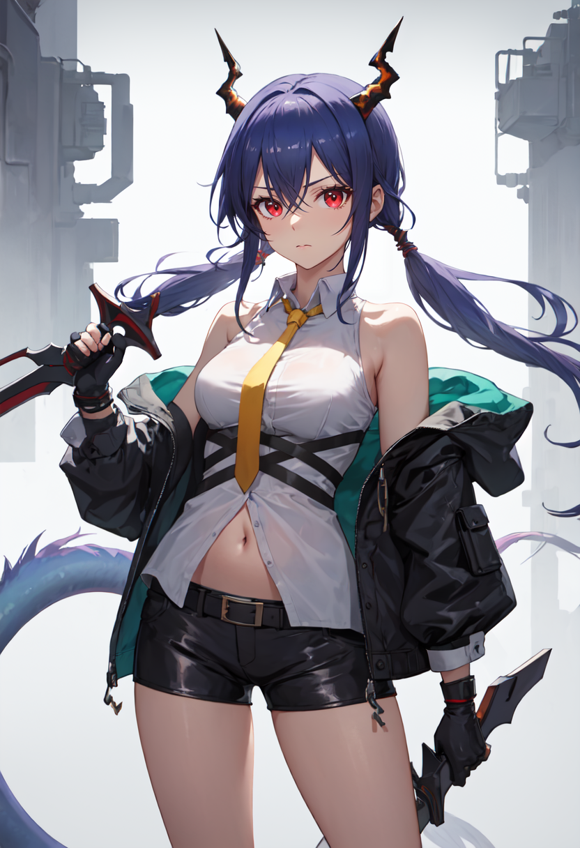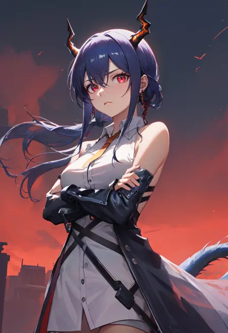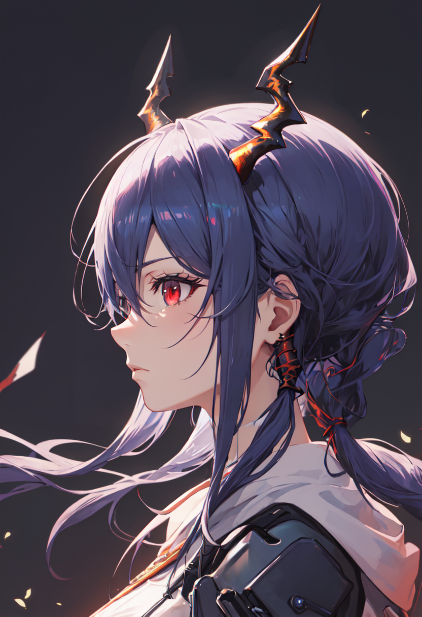- The pruned character tags are horns, blue hair, dragon horns, long hair, red eyes, hair between eyes, breasts, dragon tail, tail, medium breasts, twintails, sidelocks. You can add them into prompts when core features (e.g. hair color) of character is not so stable.