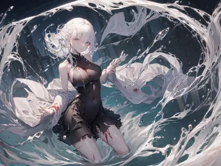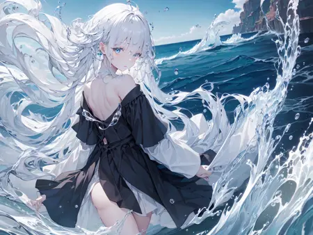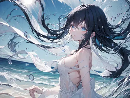 液体ヘア効果LoRAの失敗作(by(failed) product)であり、本来は髪に水のような質感や印象を与えることを目的としていたが、望ましい効果が髪以外の領域に大幅に漏れ出てしまっている。しかし、驚くほど美しい仕上がりになっている。