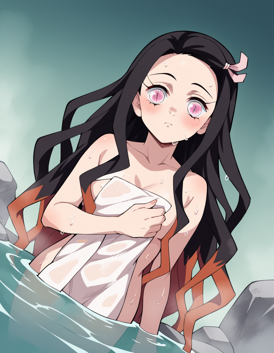 nezuko kamado、竹、口かめ、黒髪、額、口かめ、口かめされた、髪リボン、長髪、多色髪、ピンクの目、オレンジ髪、縦の瞳孔、波状の髪、二色髪、