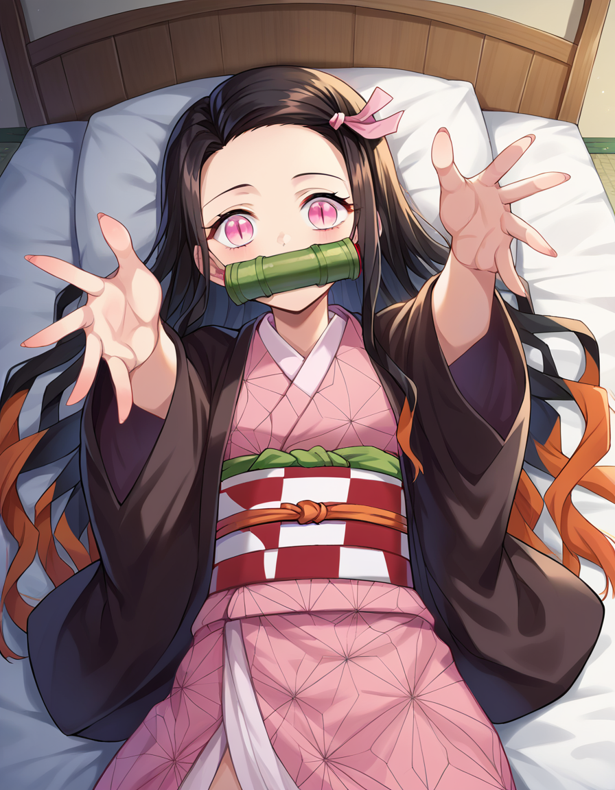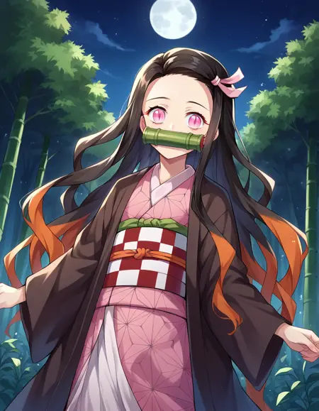 nezzuko kamado,竹子,口塞,黑发,额头,口塞,被塞住嘴,发带,长发,多色发,粉红眼睛,橙色头发,竖瞳,波浪发,双色发,
