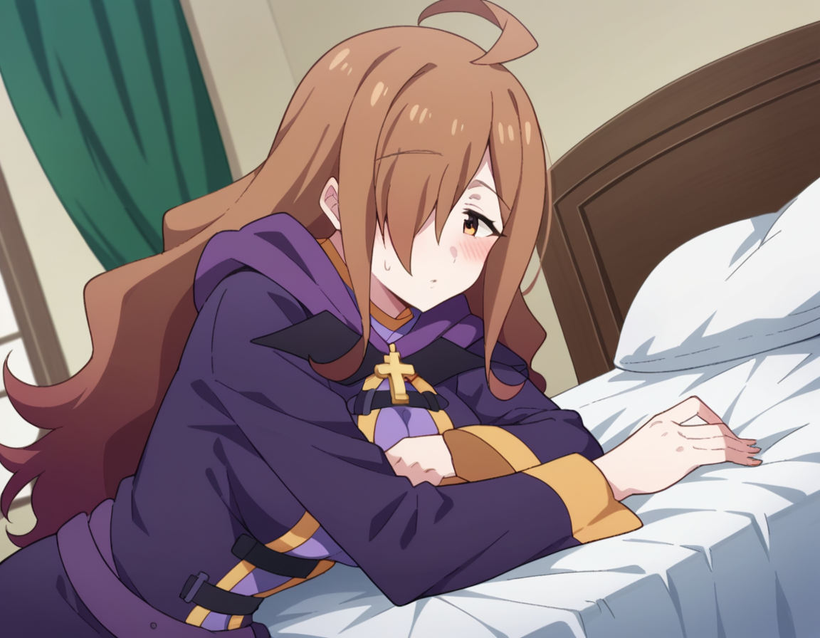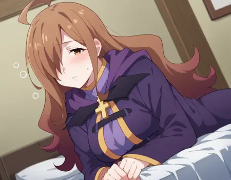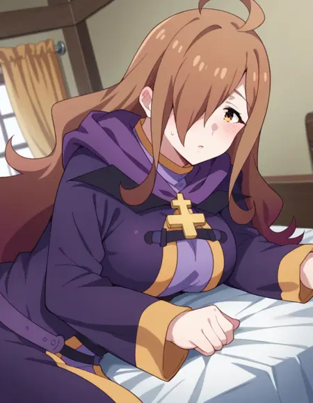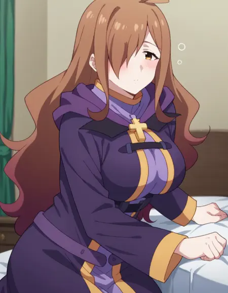 cross, dress, hood, hood down, jewelry, latin cross, long dress, long sleeves, purple dress, robe, purple robe,