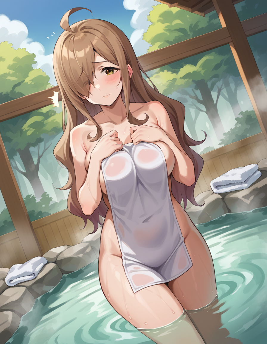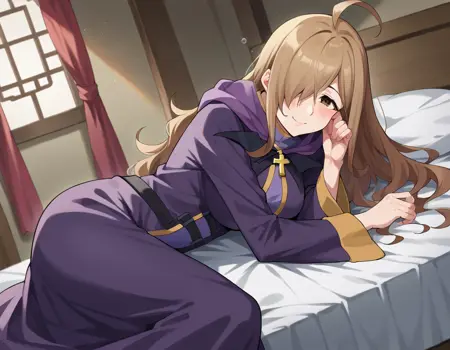 wiz, ahoge, brown eyes, light brown hair, hair over one eye, long hair,
