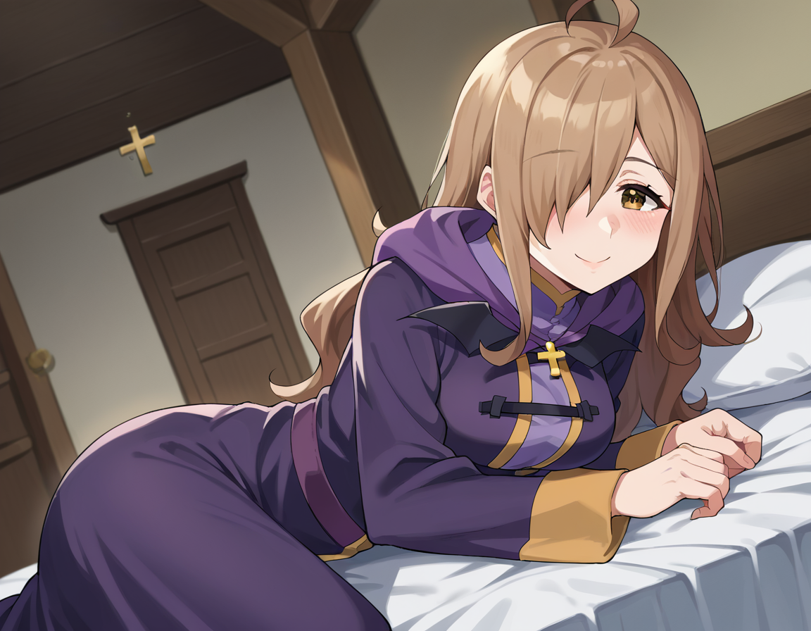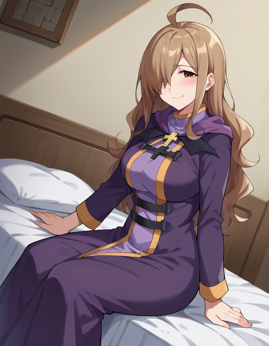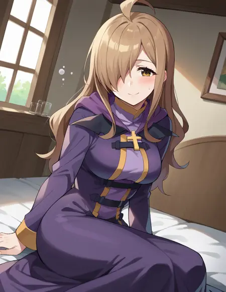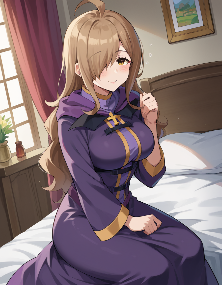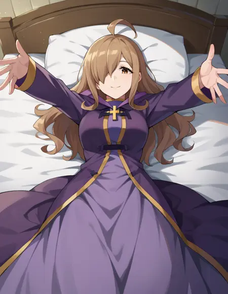 cross, dress, hood, hood down, jewelry, latin cross, long dress, long sleeves, purple dress, robe, purple robe,
