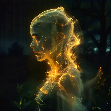 abstract, bare tree, blue-core, blue-trail, blurry, breasts, face, fog, forest, glowing, light-of-anzhu, long hair, no humans, short hair, sitting, solo, standing, transparent, very long hair, walking, yellow-arms, yellow-core, yellow-trail,