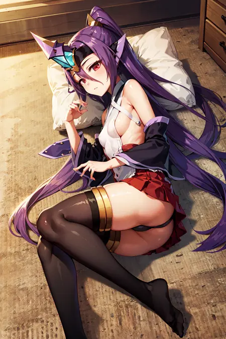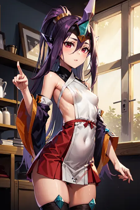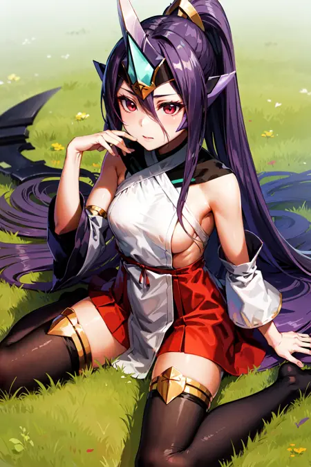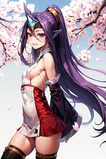 izanami1, 1girl, solo, sideboob, detached sleeves, very long hair, black thighhighs, half updo