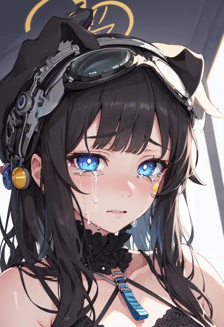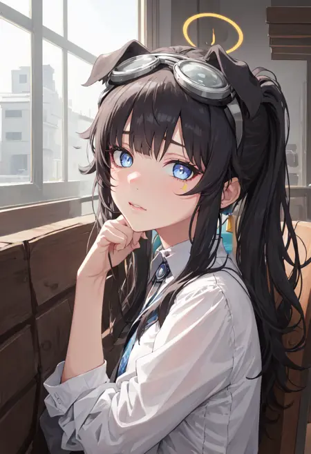 トリガーワードは hibiki_bluearchive で、削除されたタグは long_hair, animal_ears, black_hair, dog_ears, dog_girl, halo, breasts, goggles_on_head, dog_tail, tail, yellow_halo, blue_eyes, eyewear_on_head, medium_breasts, ponytail です。ある時、特定の特徴(例:髪の色)が安定しない場合、これらのタグをプロンプトに追加してください。