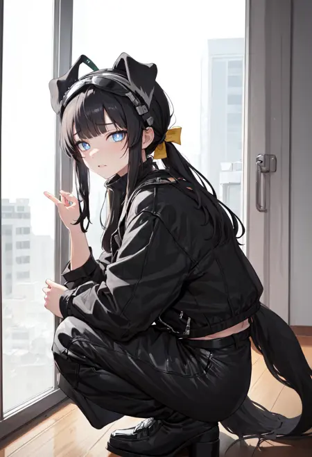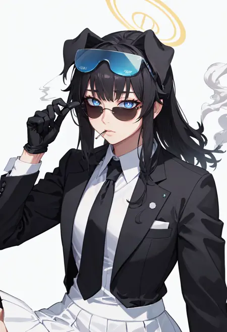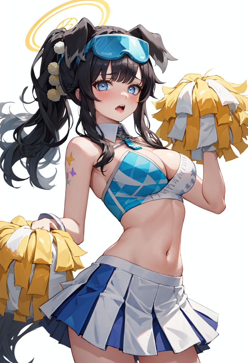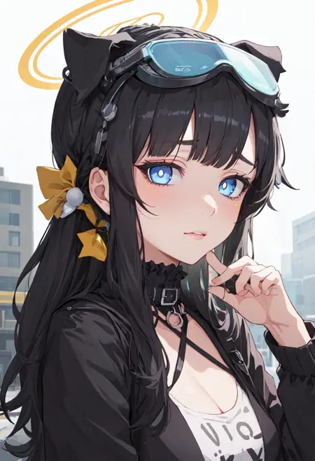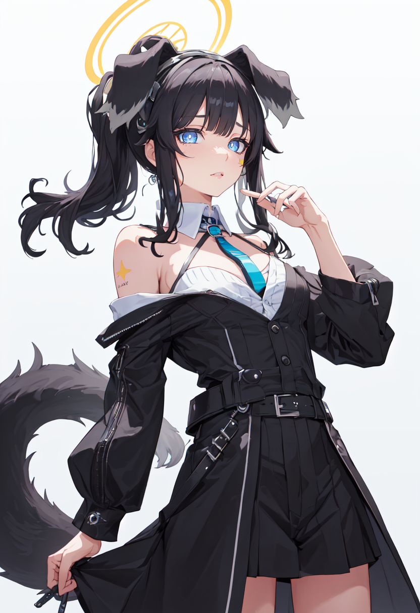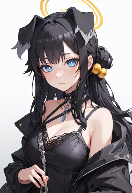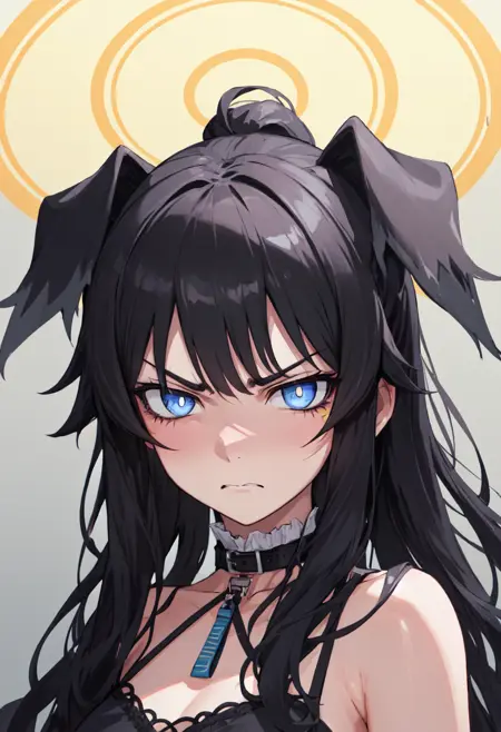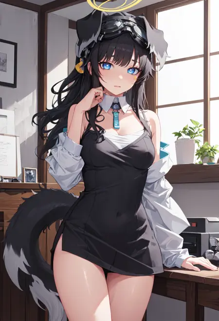 - The pruned character tags are long hair, animal ears, black hair, dog ears, dog girl, halo, breasts, goggles on head, dog tail, tail, yellow halo, blue eyes, eyewear on head, medium breasts, ponytail. You can add them into prompts when core features (e.g. hair color) of character is not so stable.