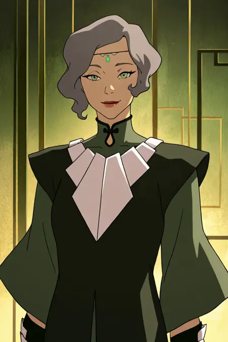 Suyin Beifong - aaSuyinBeiFong, short hair, grey hair, green dress, neck plating, lipstick, red lips,