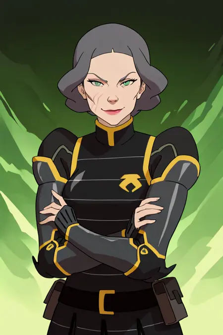 Lin Beifong - aaLinBeiFong, armor, short hair, green eyes, grey hair, black uniform, makeup, scar, crossed arms, lipstick,