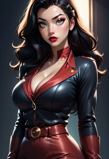 Asami Sato - aaAsami, light green eyes, red collar, black jacket, long hair, black hair, green eyes, jacket, belt, makeup, lipstick, black dress,