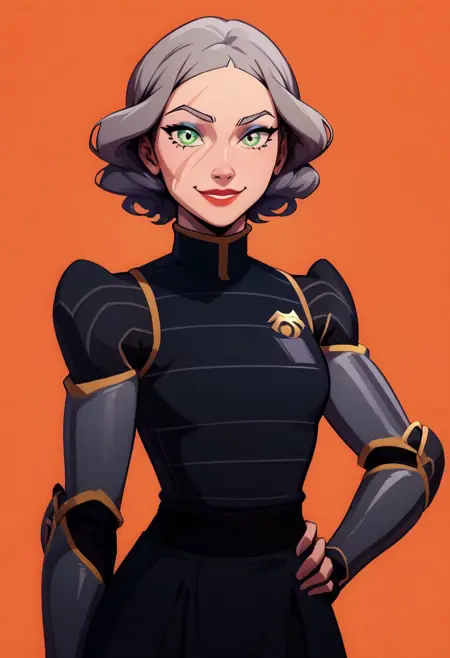 Lin Beifong - aaLinBeiFong, armor, short hair, green eyes, grey hair, black uniform, makeup, scar, crossed arms, lipstick,