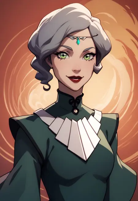 Suyin Beifong - aaSuyinBeiFong, short hair, grey hair, green dress, neck plating, lipstick, red lips,