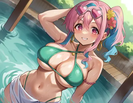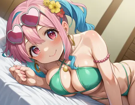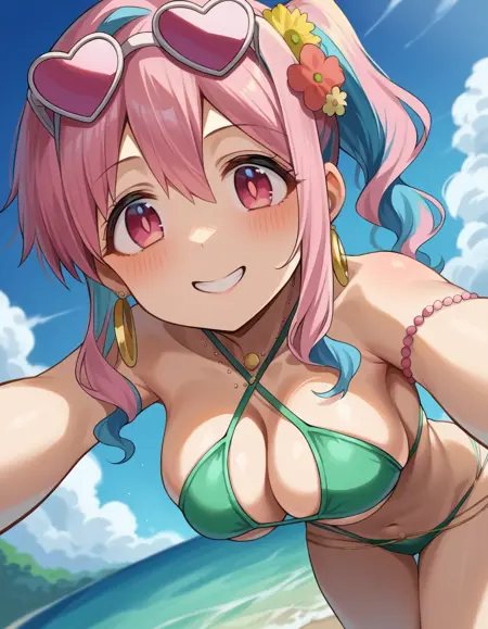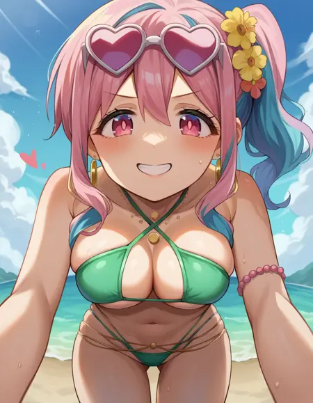 bikini, collarbone, criss-cross halter, earrings, eyewear on head, green bikini, grey-framed eyewear, hair flower, hair ornament, halterneck, heart, heart-shaped eyewear, highleg, highleg bikini, hoop earrings, jewelry, navel, necklace, pink-tinted eyewear, red-tinted eyewear, skindentation, stomach, sunglasses, swimsuit, tinted eyewear, underboob, yellow flower,