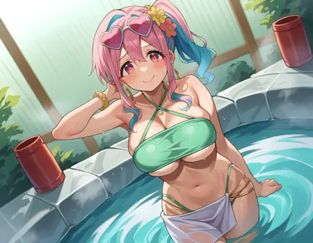 比基尼, 锁骨, 交叉系带背心, 耳环, 眼镜戴在头上, 绿色比基尼, 灰框眼镜, 头发花朵, 发饰, 吊带式, 心形, 心形眼镜, 高开叉, 高开叉比基尼, 圆环耳环, 饰品, 肚脐, 项链, 粉色镜片眼镜, 红色镜片眼镜, 裙子压痕, 腹部, 太阳镜, 泳装, 镜片眼镜, 下胸围, 黄色花朵,