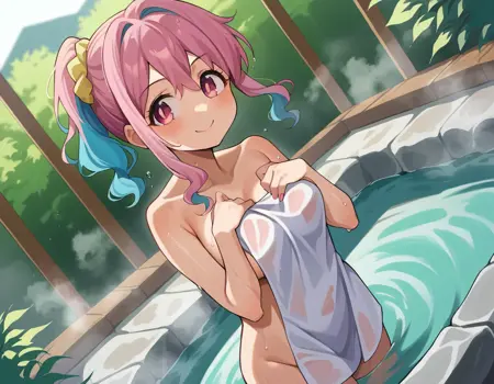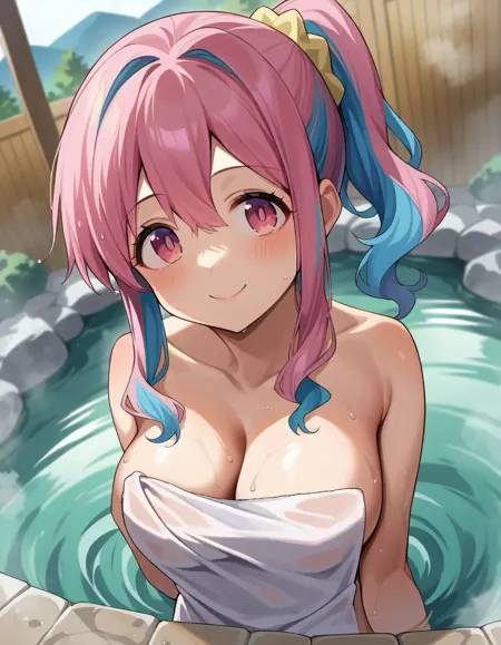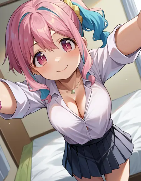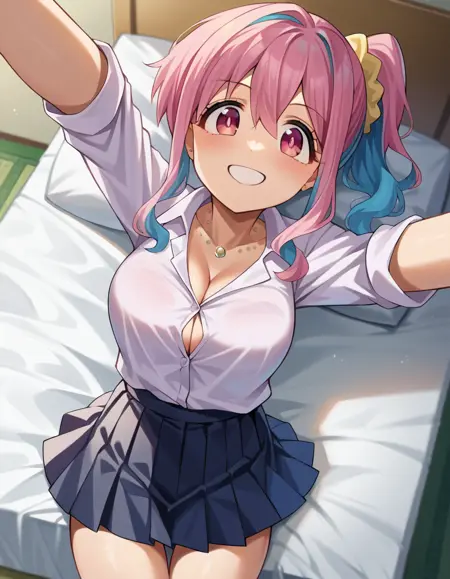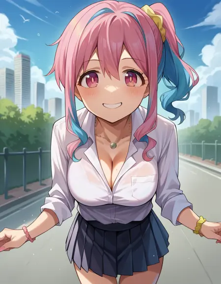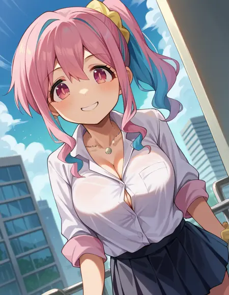 kaede hozuki, 1girl, blue hair, gyaru, hair between eyes, hair ornament, hair scrunchie, multicolored hair, pink eyes, pink hair, side ponytail, sidelocks, two-tone hair, yellow scrunchie,