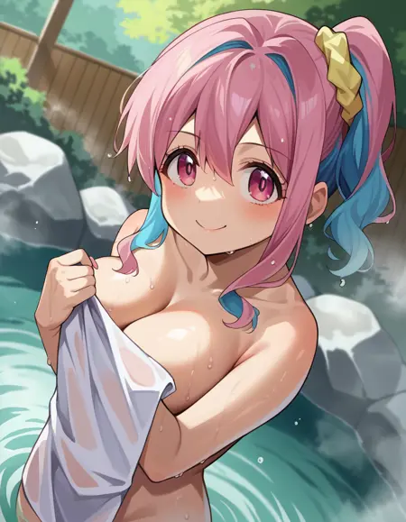 kaede hozuki, 1girl, 蓝发, gyaru, 发丝遮眼, 发饰, 发圈, 多色发, 粉眼, 粉发, 侧马尾, 侧发, 双色发, 黄色发圈,
