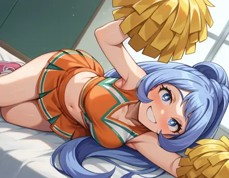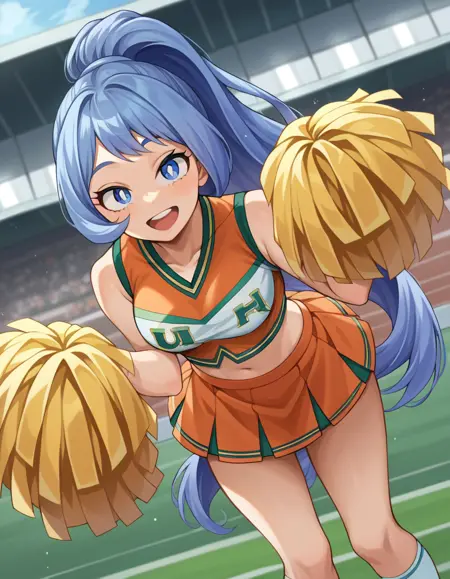cheerleader, crop top, holding pom poms, midriff, navel, orange skirt, pink footwear, pom pom \(cheerleading\), pom poms, ponytail, skirt, u.a. cheerleader uniform,