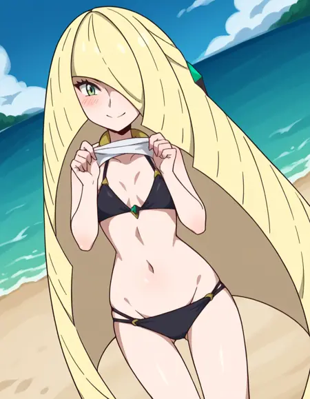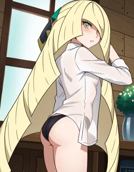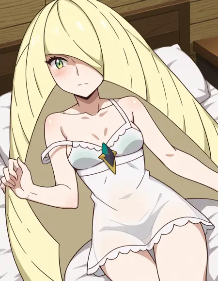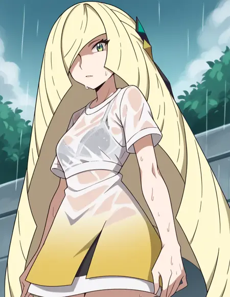 pokemonlusamine, blonde hair, green eyes, hair over one eye, long hair, multicolored hair, streaked hair, very long hair,
