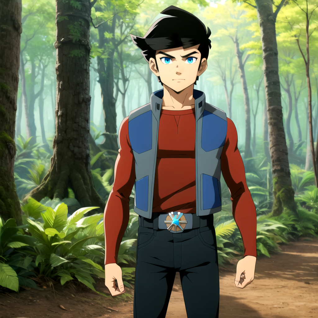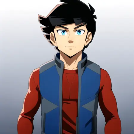 solo, 1boy, Ky Stax, blue eyes, black hair, vest, red shirt, long sleeves,