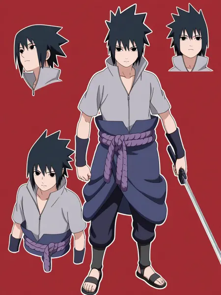 extra tags:Sasuke Uchiha, black hair, spiky hair, black eyes, gray shirt with short sleeves,black arm guard,light purple belt,purple skirt,pants,sandals