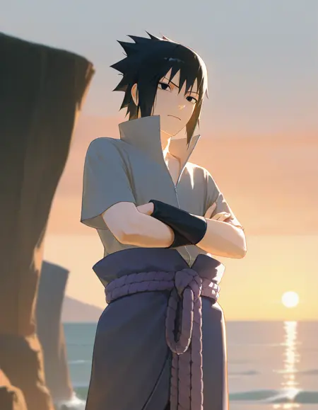extra tags:Sasuke Uchiha, black hair, spiky hair, black eyes, gray shirt with short sleeves,black arm guard,light purple belt,purple skirt,pants,sandals