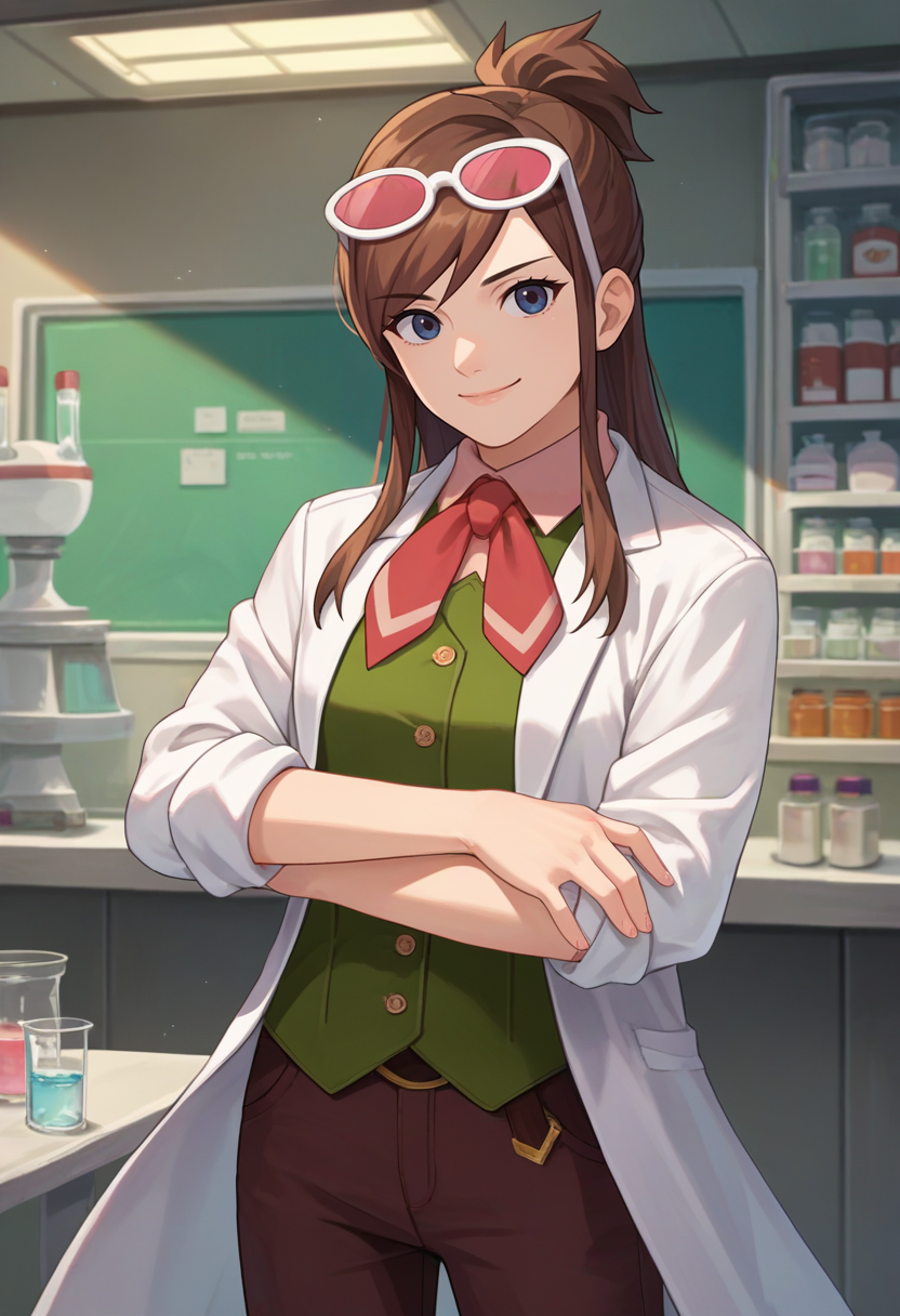 Default Outfit: sunglasses, eyewear on head, white lab coat, sleeves rolled up, green vest, red neckerchief, brown pants