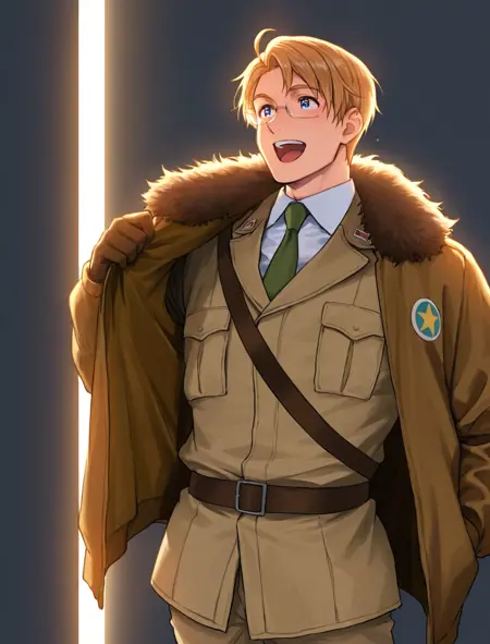 military uniform, necktie, white shirt, brown vest, belt, brown pants, fur coat, brown jacket