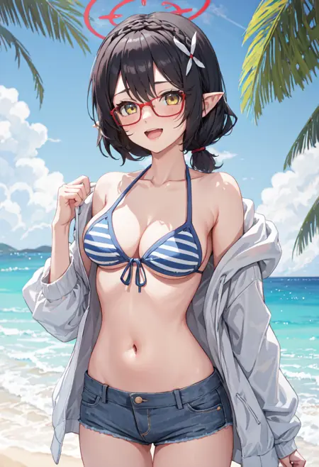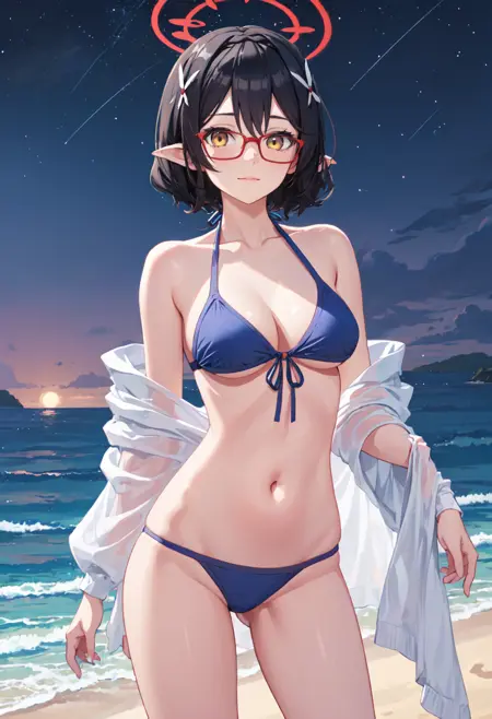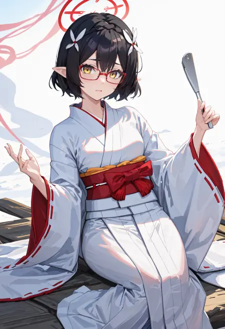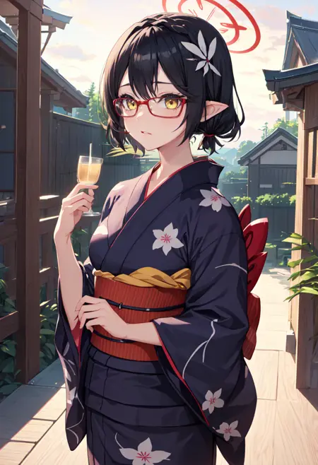 • The pruned character tags are black hair, pointy ears, short hair, glasses, halo, red-framed eyewear, hair ornament, yellow eyes, braid, breasts, red halo, hair flower. You can add them into prompts when core features (e.g. hair color) of character is not so stable.