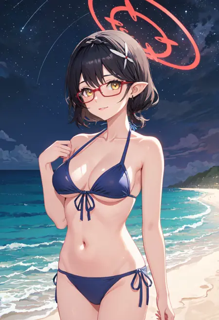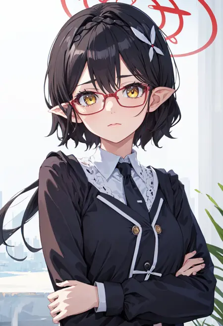 The trigger word is ayane_bluearchive, and the pruned tags are black_hair, pointy_ears, short_hair, glasses, halo, red-framed_eyewear, hair_ornament, yellow_eyes, braid, breasts, red_halo, hair_flower. When some features (e.g. hair color) are not so stable at some times, you can add these them into your prompt.