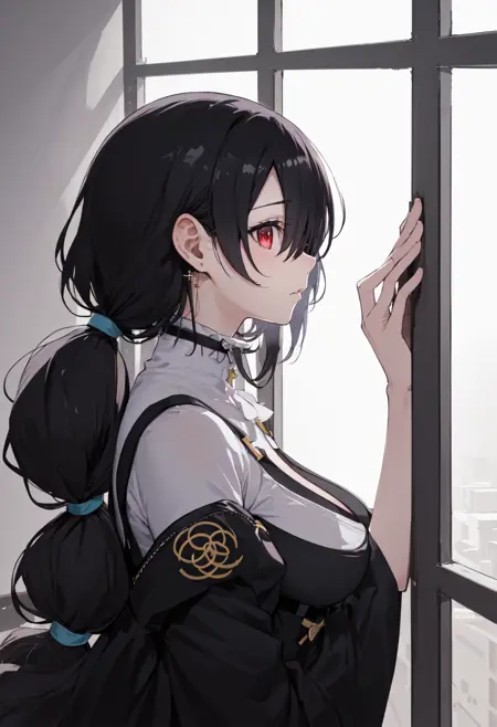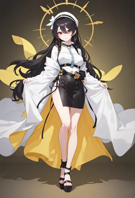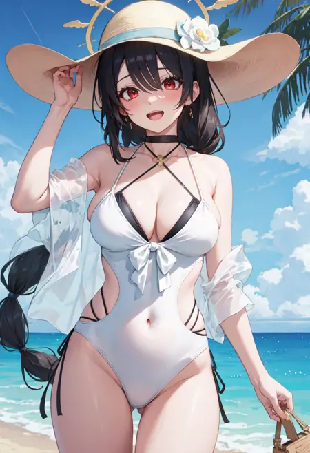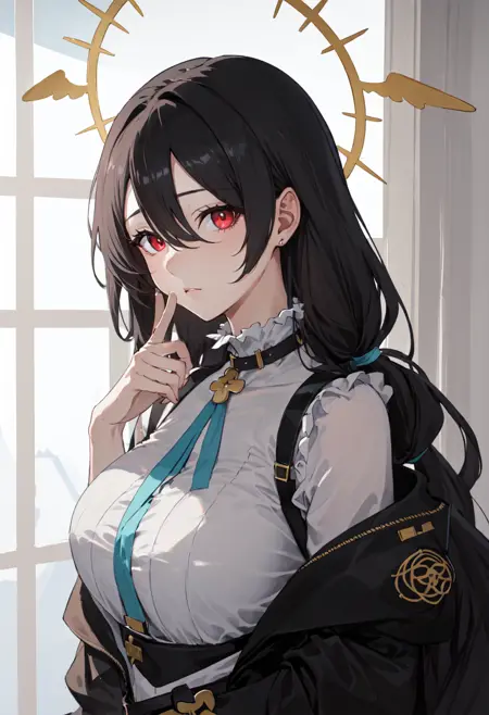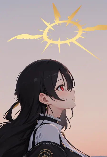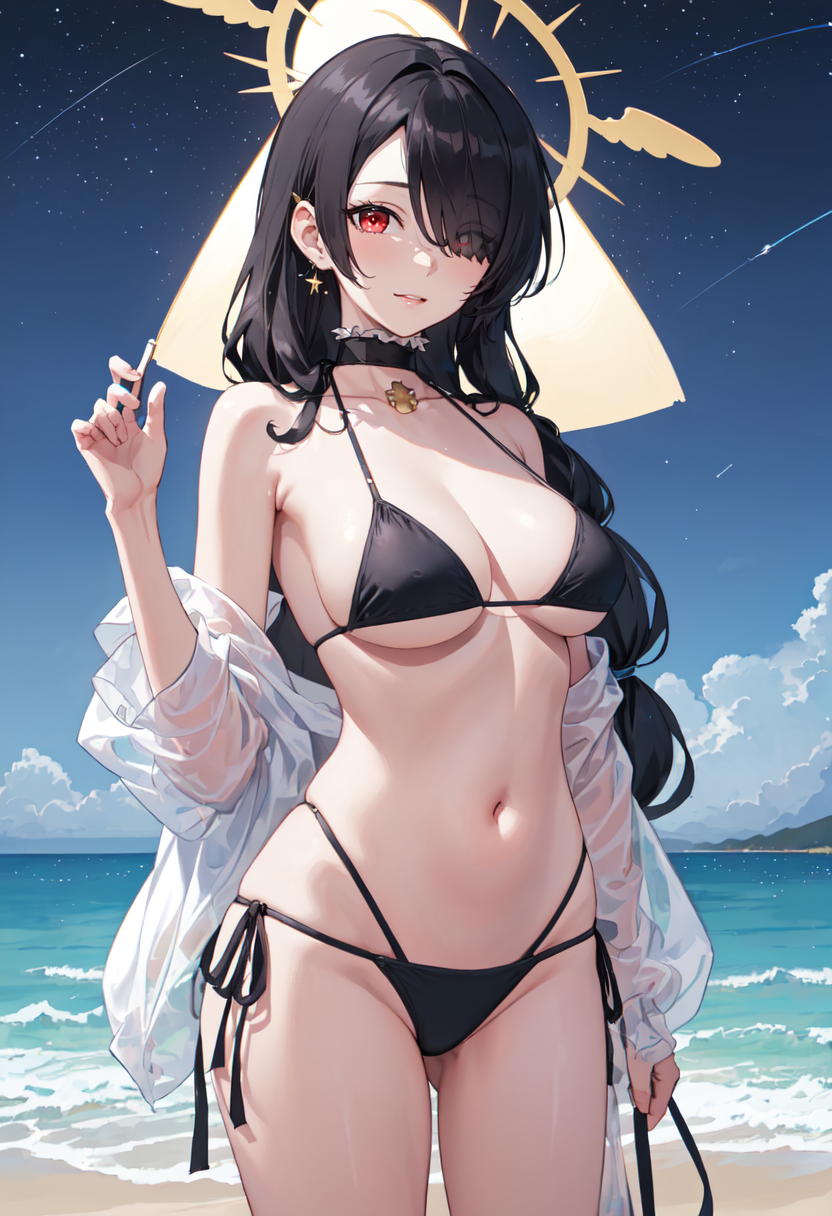 - The pruned character tags are long hair, black hair, breasts, halo, hair over one eye, large breasts, red eyes, earrings, cross earrings, very long hair, hat, sun hat. You can add them into prompts when core features (e.g. hair color) of character is not so stable.