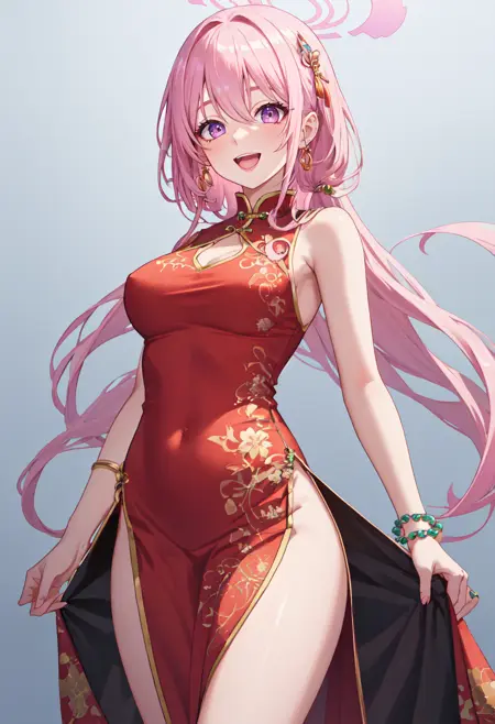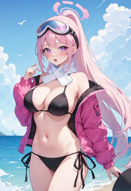 触发词为 eimi_bluearchive,剪枝标签为 pink_hair, breasts, halo, long_hair, large_breasts, pink_eyes, pink_halo, goggles_on_head, ponytail, purple_eyes, very_long_hair当某些特征(如发色)有时不够稳定时,您可以将这些标签添加到提示词中
