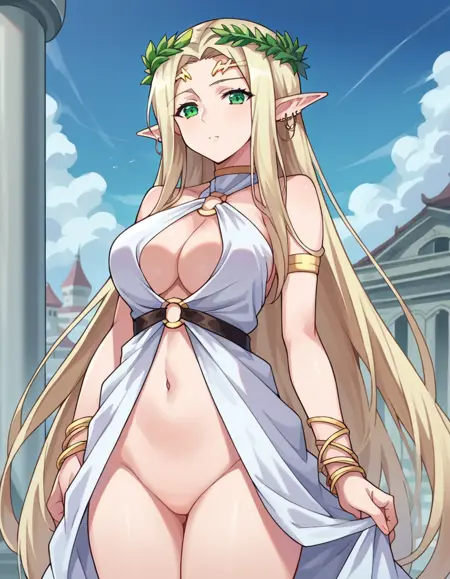 cleavage, bare shoulders, jewelry, earrings, bracelet, groin, no panties, convenient censoring, circlet, head wreath, laurel crown,