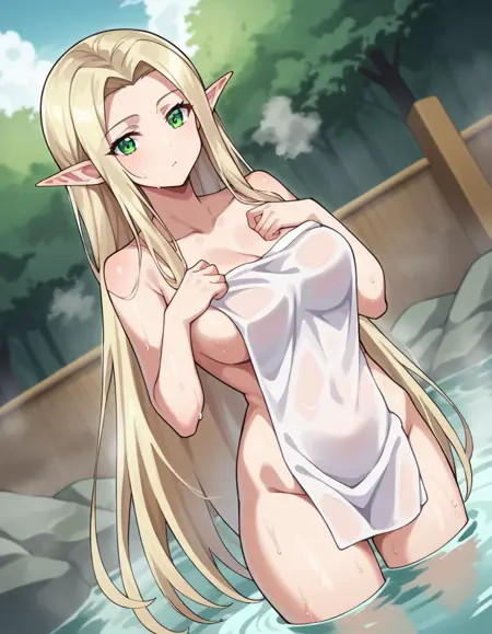 celestine lucullus, blonde hair, very long hair, green eyes, pointy ears, elf,