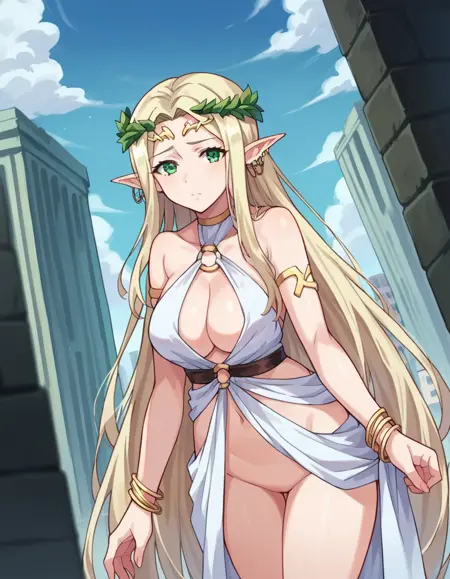 cleavage, bare shoulders, jewelry, earrings, bracelet, groin, no panties, convenient censoring, circlet, head wreath, laurel crown,